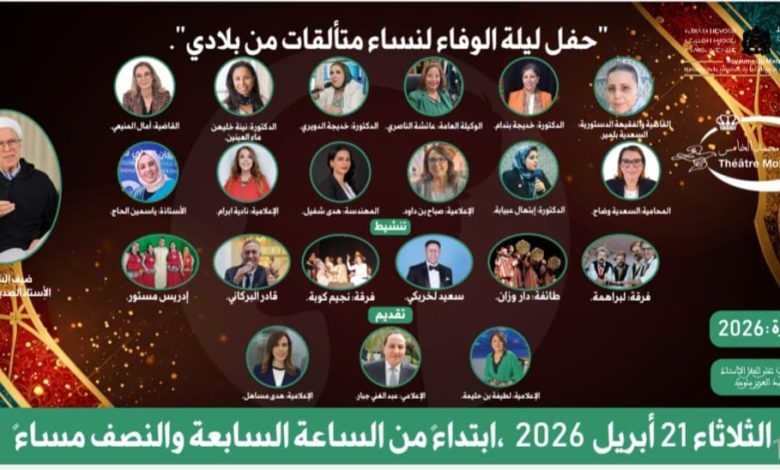 بدعم من وزارة الشباب والثقافة والتواصل قطاع الثقافة والمسرح الوطني محمد الخامس بالرباط، تنظم ثلة من الفعاليات الإعلامية والجمعوية النسخة 2026 من حفل ليلة الوفاء لنساء متألقات من بلادي.